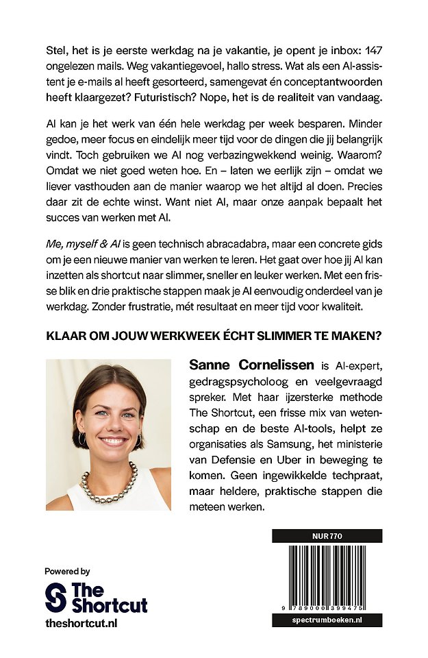 Me, myself & AI is geen technisch abracadabra, maar een concrete gids om je een nieuwe manier van werken te leren. Het gaat over hoe jij AI kan inzetten als shortcut naar slimmer, sneller en leuker werken. Met een frisse blik en drie praktische stappen maak je AI eenvoudig onderdeel van je werkdag. Zonder frustratie, mét resultaat en meer tijd voor kwaliteit.