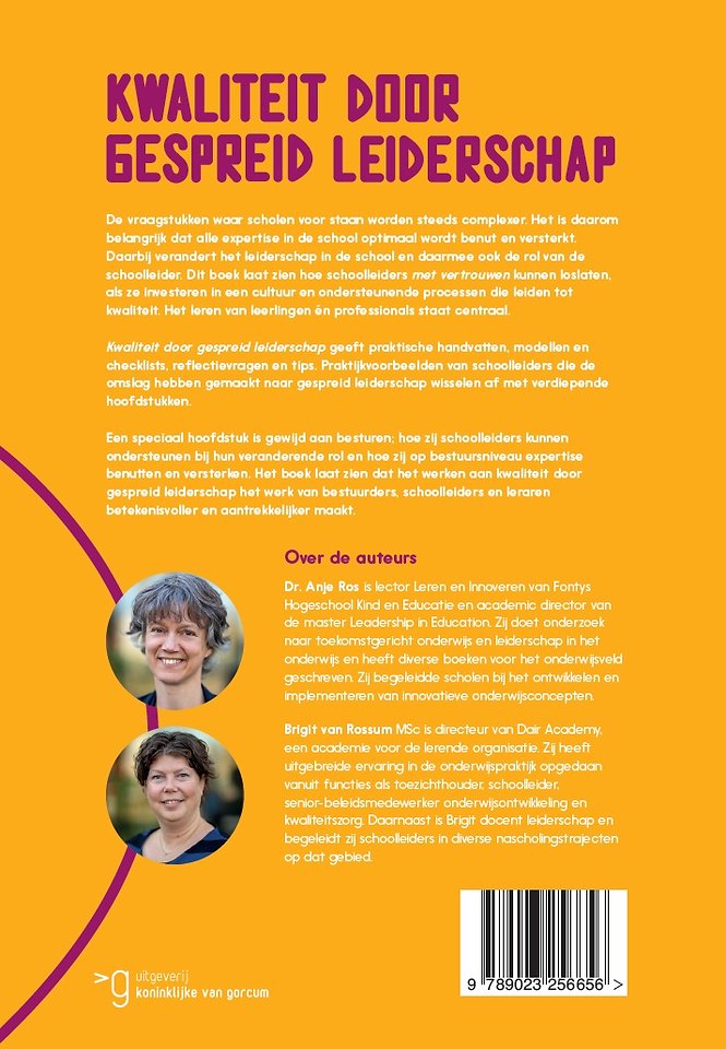 Kwaliteit door gespreid leiderschap geeft praktische handvatten, modellen en checklists, reflectievragen en tips. Praktijkvoorbeelden van schoolleiders die de omslag hebben gemaakt naar gespreid leiderschap wisselen af met verdiepende hoofdstukken.