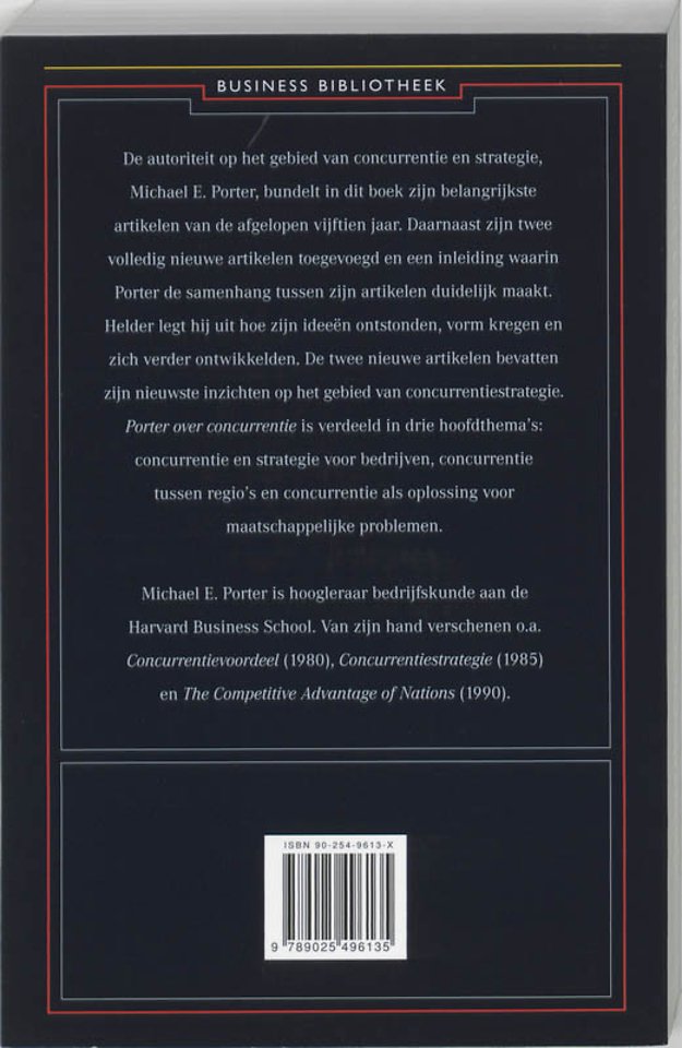 Meer over Michael PorterDe autoriteit op het gebied van concurrentie en strategie, Michael E. Porter, bundelt in dit boek zijn belangrijkste artikelen van de afgelopen vijftien jaar. Daarnaast zijn twee volledig nieuwe artikelen toegevoegd en een inleiding waarin Porter de samenhang tussen zijn artikelen duidelijk maakt. Helder legt hij uit hoe zijn ideeën ontstonden, vorm kregen en zich verder ontwikkelden. De twee nieuwe artikelen bevatten zijn nieuwste inzichten op het gebied van concurrentiestrategie. 'Porter over concurrentie' is verdeeld in drie hoofdthema's: concurrentie en strategie voor bedrijven, concurrentie tussen regio' s en concurrentie als oplossing voor maatschappelijke problemen.