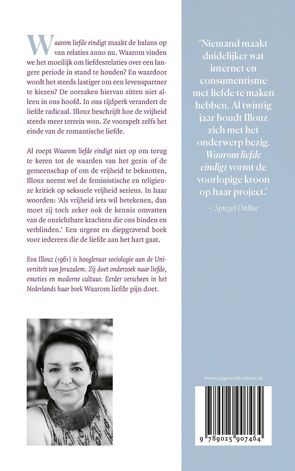 In Waarom liefde eindigt maakt Eva Illouz de balans op van relaties anno nu. Waarom vinden we het moeilijk om over langere tijd relaties in stand te houden? En waardoor wordt de partnerkeuze steeds lastiger?