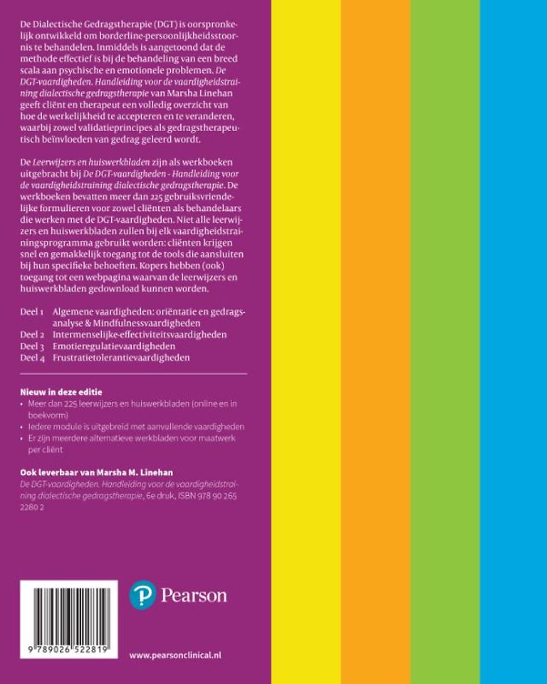 De Dialectische Gedragstherapie (DGT) is oorspronkelijk ontwikkeld om borderline-persoonlijkheidsstoornis te behandelen. Inmiddels is aangetoond dat de methode effectief is bij de behandeling van een breed scala aan psychische en emotionele problemen. De DGT-vaardigheden. Handleiding voor de vaardigheidstraining dialectische gedragstherapie van Marsha Linehan geeft cliënt en therapeut een volledig overzicht van hoe de werkelijkheid te accepteren en te veranderen, waarbij zowel validatieprincipes als gedragstherapeutisch beïnvloeden van gedrag geleerd wordt.