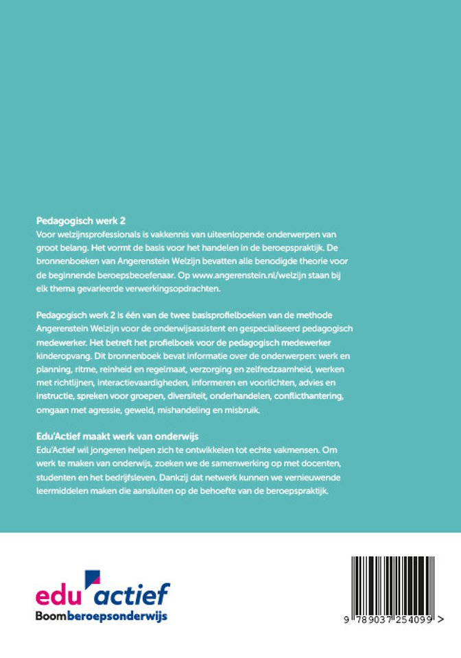 Pedagogisch werk 2 is een van de twee basisprofielboeken van de methode Angerenstein Welzijn voor de onderwijsassistent en gespecialiseerd pedagogisch medewerker. Het betreft het profielboek voor de pedagogisch medewerker kinderopvang. Dit bronnenboek bevat informatie over de onderwerpen: werk en planning, ritme, reinheid en regelmaat, verzorging en zelfredzaamheid, werken met richtlijnen, interactievaardigheden, informeren en voorlichten, advies en instructie, spreken voor groepen, diversiteit, onderhandelen, conflicthantering, omgaan met agressie, geweld, mishandeling en misbruik.
