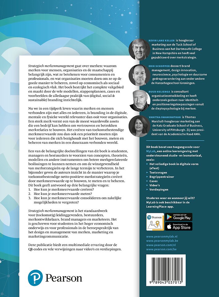 Meer over de auteurs'Strategisch merkenmanagement' gaat over merken, waarom merken voor mensen, organisaties en de maatschappij belangrijk zijn, wat ze betekenen voor consumenten en professionals en wat organisaties moeten doen om ze op de goede manier te beheren, zowel op economisch als sociaal en ecologisch vlak. Het boek bestrijkt het complete vakgebied en maakt door de vele modellen, stappenplannen, cases en voorbeelden de alledaagse praktijk van (digital, social & sustainable) branding inzichtelijk. 'Strategisch merkenmanagement' is het standaardwerk voor (toekomstig) leidinggevenden, bestuurders, merkontwikkelaars, brand managers en marketeers en een onmisbare titel binnen het hoger (economisch) onderwijs.