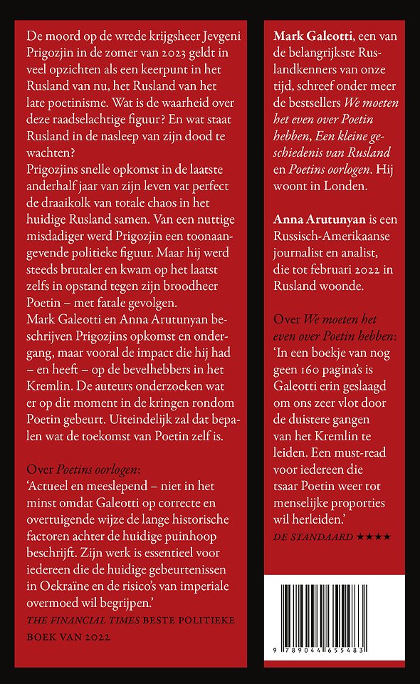 Mark Galeotti en Anna Arutunyan beschrijven Prigozjins opkomst en ondergang, maar vooral de impact die hij had – en heeft – op de bevelhebbers in het Kremlin. De auteurs onderzoeken wat er op dit moment in de kringen rondom Poetin gebeurt. Uiteindelijk zal dat bepalen wat de toekomst van Poetin zelf is.