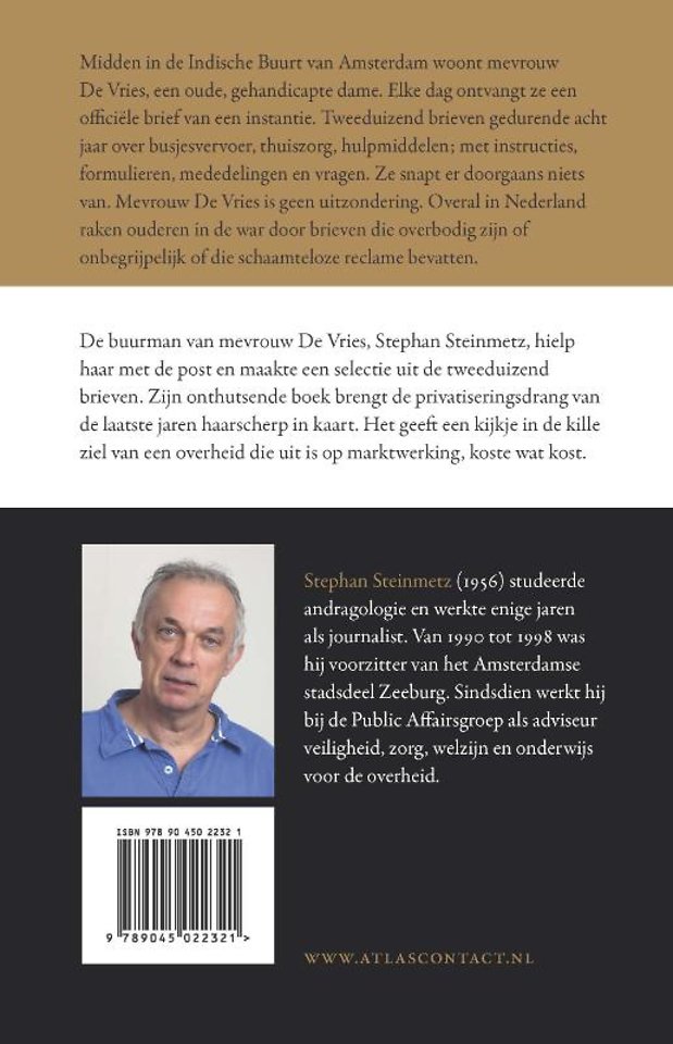 Meer over Stephan SteinmetzMidden in de Indische buurt van Amsterdam woont mevrouw De Vries, een oude, gehandicapte dame. De laatste jaren ontvangt ze elke dag een officiële brief van een instantie. Nu eens van de overheid, dan weer van de winnaar van een aanbesteding. Tweeduizend brieven gedurende acht jaar. Brieven over busjesvervoer, thuiszorg, hulpmiddelen; brieven met instructies, formulieren, mededelingen en vragen.