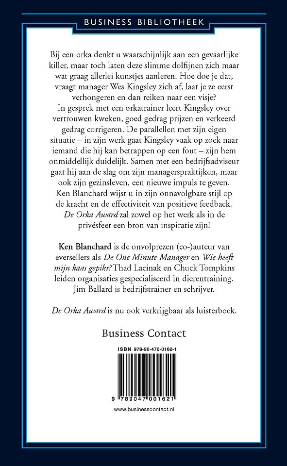 Meer over Kenneth BlanchardBij een orka denkt u waarschijnlijk aan een gevaarlijke killer, maar toch laten deze slimme dolfijnen zich maar wat graag allerlei kunstjes aanleren. Hoe doe je dat, vraagt manager Wes Kingsley zich af, laat je ze eerst verhongeren en dan reiken naar een visje?