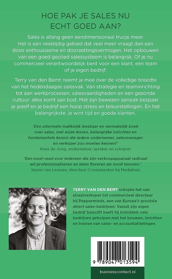 Meer over Terry van den BemtTerry van den Bemt legt in ‘De Sales Architect’ uit hoe je sales nu echt goed aanpakt. Sales is allang geen eendimensionaal trucje meer. Het is een veelzijdig gebied dat veel meer vraagt dan een dosis enthousiasme en doorzettingsvermogen. Het opbouwen van een goed geolied salessysteem is belangrijk. Of je nu commercieel verantwoordelijk bent voor een klant, een team of je eigen bedrijf.