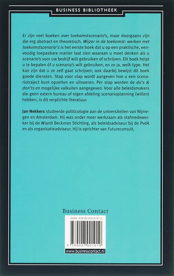 Meer over Jan Nekkers'Wijzer in de toekomst' van Jan Nekkers heeft zich bewezen als hét handboek voor wie zelf met toekomstscenario’s aan de slag wil. Goede scenario’s helpen je om de impact van een veranderende omgeving te begrijpen én om een toekomstgerichte strategie te bepalen.