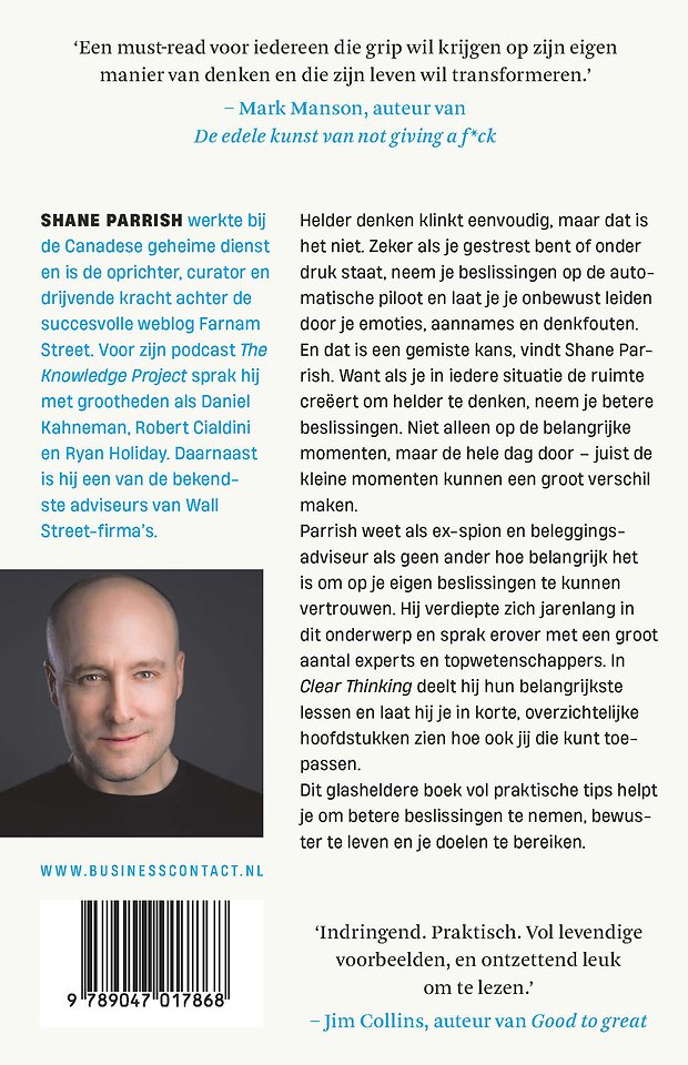 Meer over Shane ParrishHelder denken klinkt eenvoudig, maar dat is het niet. Zeker als je gestrest bent of onder druk staat, neem je beslissingen op de automatische piloot en laat je je onbewust leiden door je emoties, aannames en denkfouten. En dat is een gemiste kans, vindt Shane Parrish, want juist als je in iedere situatie de ruimte creëert om helder te denken, neem je betere beslissingen. Niet alleen op de belangrijke momenten, maar de hele dag door – want juist de kleine momenten kunnen een groot verschil maken.
