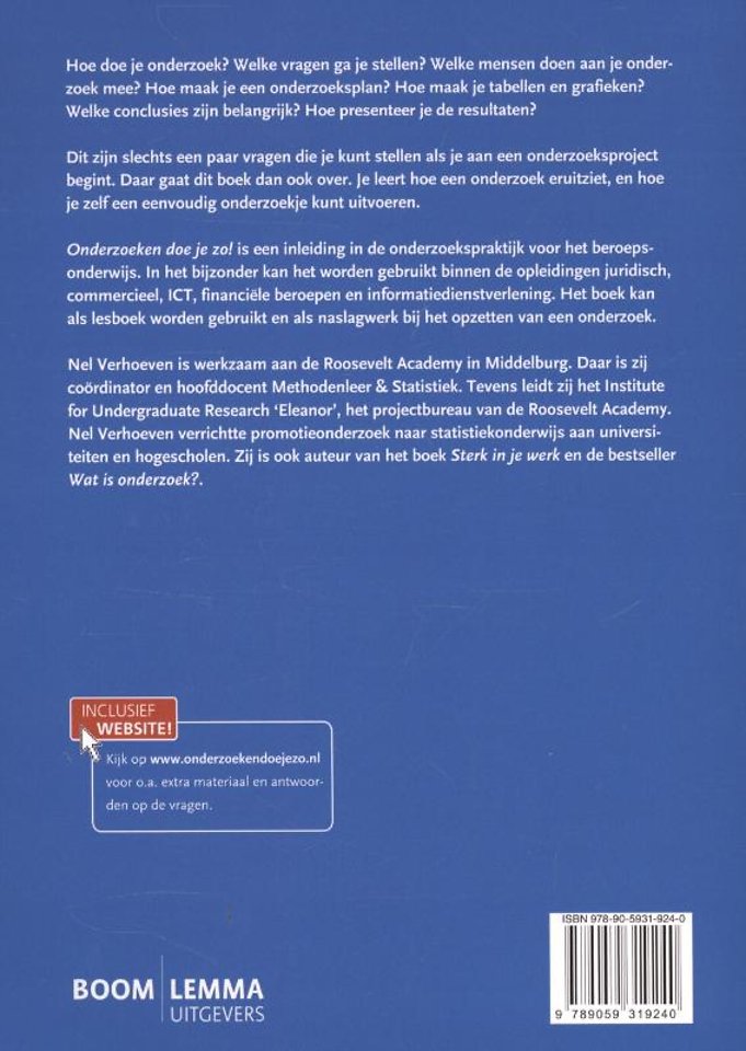 'Onderzoeken doe je zo!' is een inleiding in de onderzoekspraktijk voor het beroepsonderwijs. In het bijzonder kan het worden gebruikt binnen de opleidingen juridisch, commercieel, ICT, financiële beroepen en informatiedienstverlening. Het boek kan als lesboek worden gebruikt en als naslagwerk bij het opzetten van een onderzoek.