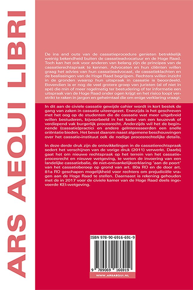 In deze derde druk zijn de ontwikkelingen in de cassatierechtspraak sedert het verschijnen van de vorige druk (2011) verwerkt. Daarbij gaat het om nieuwe rechtspraak op het terrein van het cassatieprocesrecht en nieuwe wetgeving, te weten de invoering van een landelijke cassatiebalie, de niet-ontvankelijkverklaring ‘aan de poort’ van het cassatieberoep op grond van art. 80a RO en de door art. 81a RO geschapen mogelijkheid voor rechters om prejudiciële vragen aan de Hoge Raad te stellen. Daarnaast is rekening gehouden met de in 2017 voor de civiele kamer van de Hoge Raad deels ingevoerde KEI-wetgeving.