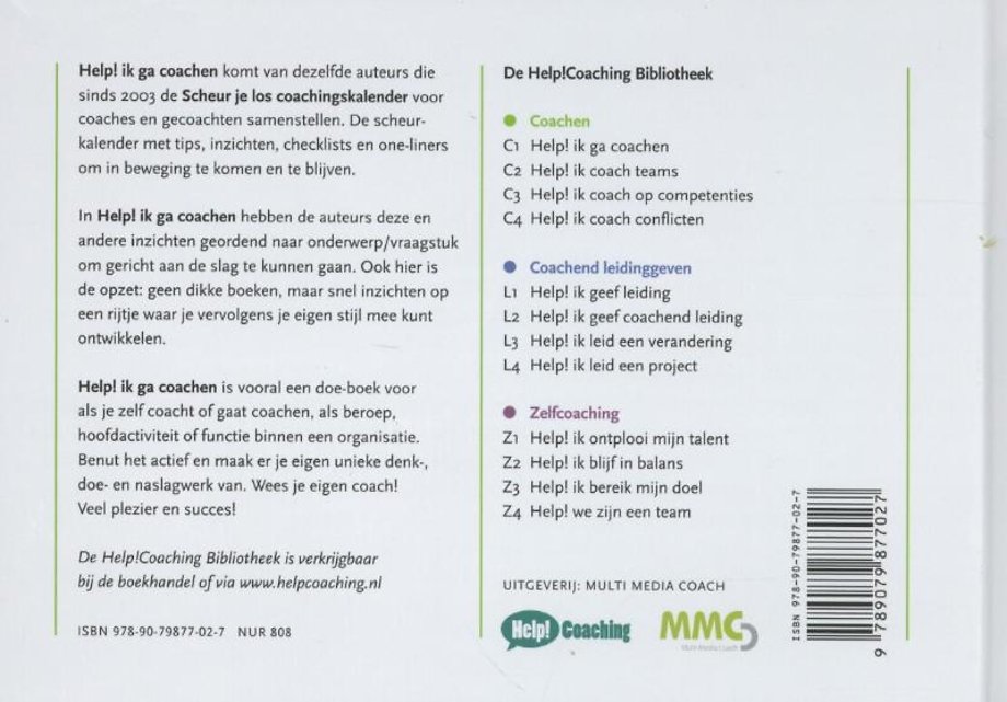In 'Help! Ik ga coachen' hebben de auteurs deze en andere inzichten geordend naar onderwerp / vraagstuk om gericht aan de slag te kunnen gaan. Ook hier is de opzet: geen dikke boeken, maar snel inzichten op een rijtje waar u vervolgens uw eigen stijl mee kunt ontwikkelen.