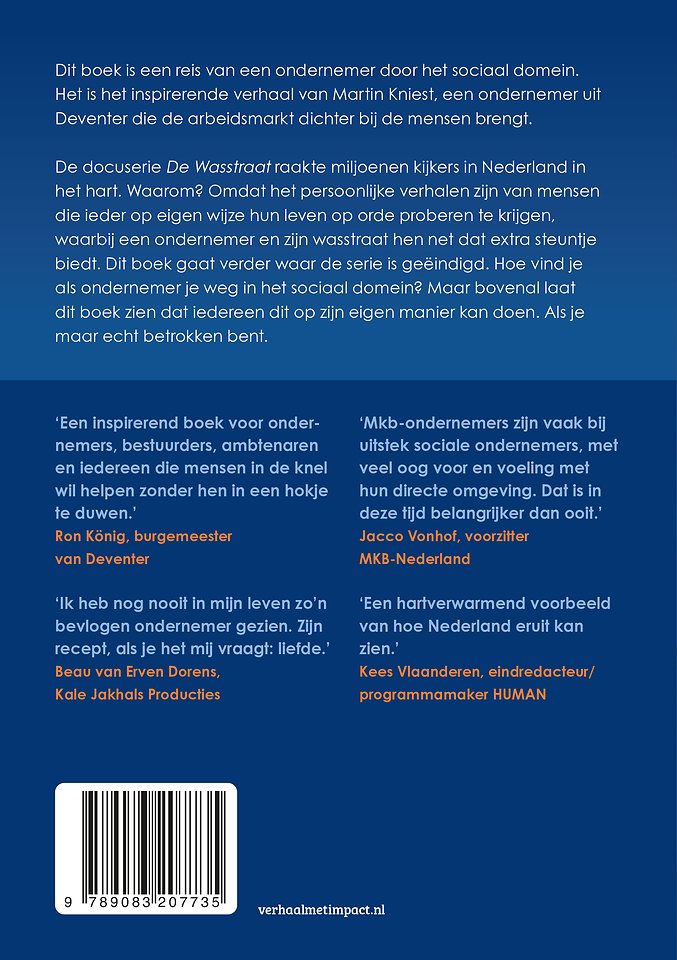De docuserie De Wasstraat raakte miljoenen kijkers in Nederland in het hart. Waarom? Omdat het persoonlijke verhalen zijn van mensen die ieder op eigen wijze hun leven op orde proberen te krijgen, waarbij een ondernemer en zijn wasstraat hen net dat extra steuntje biedt. Dit boek gaat verder waar de serie is geëindigd. Hoe vind je als ondernemer je weg in het sociaal domein? Maar bovenal laat dit boek zien dat iedereen dit op zijn eigen manier kan doen. Als je maar echt betrokken bent.