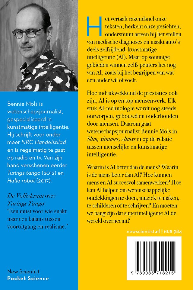 Hoe indrukwekkend de prestaties ook zijn, AI is op en top mensenwerk. Elk stuk AI-technologie wordt nog steeds ontworpen, gebouwd en onderhouden door mensen. Daarom gaat wetenschapsjournalist Bennie Mols in Slim, slimmer, slimst in op de relatie tussen menselijke en kunstmatige intelligentie.