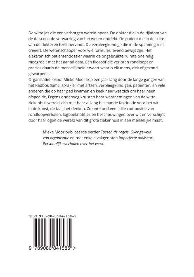 Organisatiefilosoof Mieke Moor liep een jaar lang door de lange gangen van het Radboudumc, sprak er met artsen, verpleegkundigen, patiënten, en vele anderen die op haar pad kwamen en keek naar wat zich om haar heen afspeelde. Ergens onderweg kruisten haar waarnemingen van de witte ziekenhuiswereld zich met haar al lang bestaande fascinatie voor het wit in de kunst, de taal, het denken. Zo ontstond een stille compositie van rondloopverhalen, logboeknotities en beschouwingen over wit en verschijnt door haar ogen de wereld van dit grote ziekenhuis in een menselijke maat.