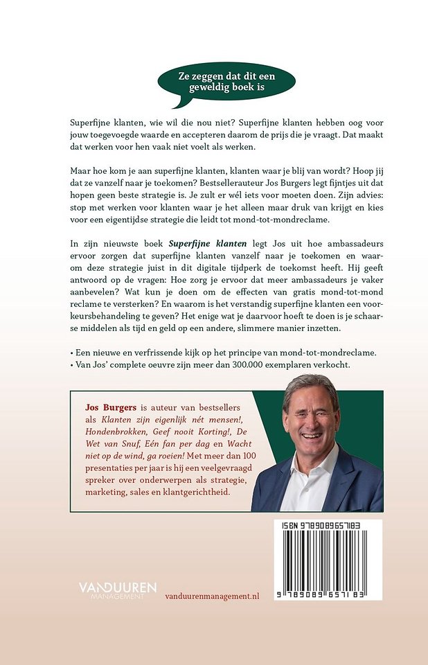 In zijn nieuwste boek 'Superfijne klanten' legt bestsellerauteur Jos Burgers uit hoe ambassadeurs ervoor zorgen dat superfijne klanten vanzelf naar je toekomen en waarom deze strategie juist in dit digitale tijdperk de toekomst heeft. Hij geeft antwoord op: Hoe zorg je ervoor dat meer ambassadeurs je vaker aanbevelen? Wat kun je doen om de effecten van gratis mond-totmond reclame te versterken? En waarom is het verstandig superfijne klanten een voorkeursbehandeling te geven? Het enige wat je daarvoor hoeft te doen is je schaarse middelen als tijd en geld op een andere, slimme manier in te zetten.