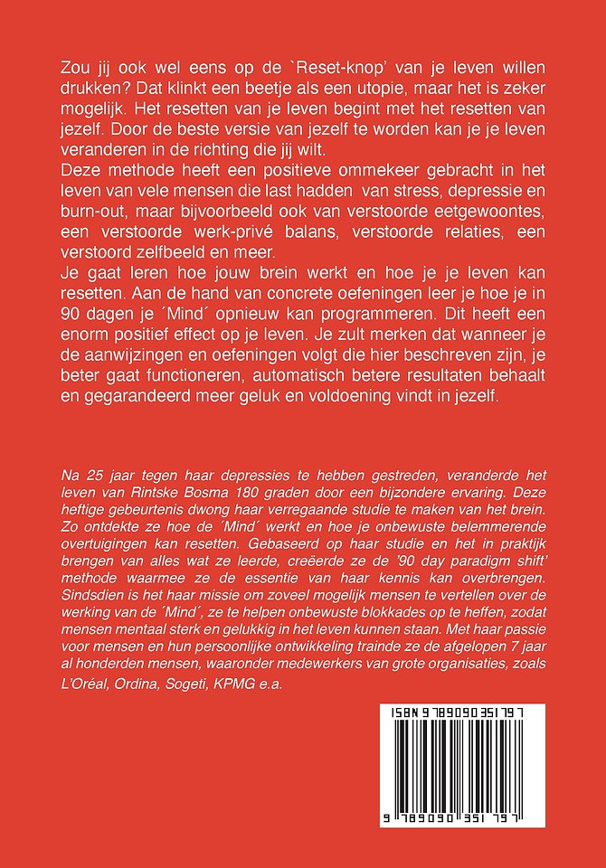 Aan de hand van concrete oefeningen leer je hoe je in 90 dagen je 'Mind' opnieuw kan programmeren. Dit heeft een enorm positief effect op je leven. Je zult merken dat wanneer je de aanwijzingen en oefeningen volgt die hier beschreven zijn, je beter gaat functioneren, automatisch betere resultaten behaalt en gegarandeerd meer geluk en voldoening vindt in jezelf.