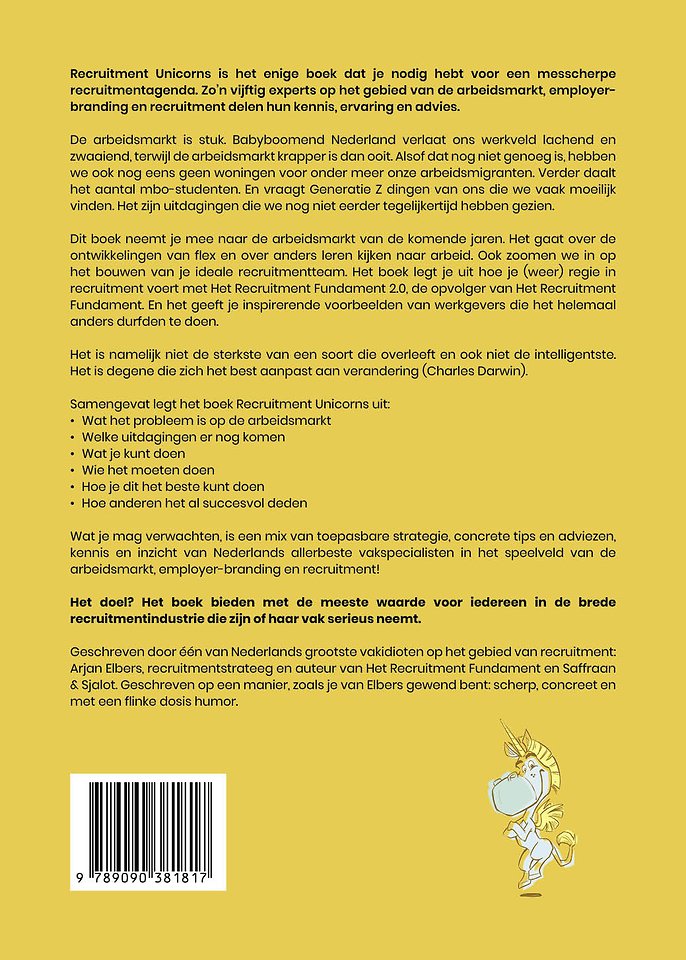 Meer over Arjan ElbersRecruitment Unicorns is het enige boek dat je nodig hebt voor een messcherpe recruitmentagenda. Zo’n vijftig experts op het gebied van de arbeidsmarkt, employer-branding en recruitment delen hun kennis, ervaring en advies.