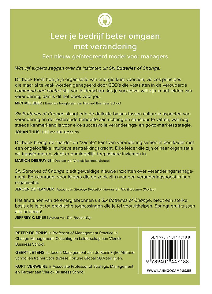 'Six Batteries of Change' biedt een verrassend eenvoudig model voor meer effectieve verandering. Gebaseerd op het idee van zes batterijen die volledig opgeladen moeten zijn om de beste resultaten te bekomen, identificeren de auteurs zes punten in organisaties die extra energie verdienen.