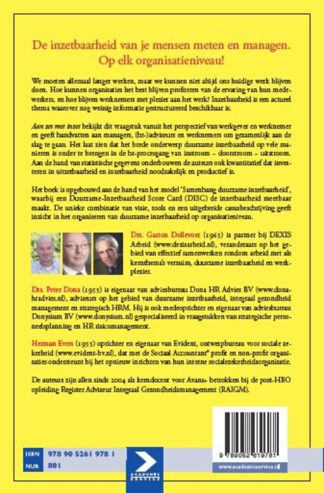 Het boek is opgebouwd aan de hand van het model 'Samenhang duurzame inzetbaarheid' waarbij een Duurzame-InzetbaarheidsScoreCard (DISC) de inzetbaarheid meetbaar maakt. De unieke combinatie van visie, tools en een uitgebreide casusbeschrijving geeft inzicht in het organiseren van duurzame inzetbaarheid op organisatieniveau.