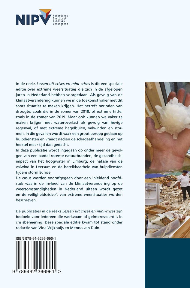 In de reeks Lessen uit crises en mini-crises is dit een speciale editie over extreme weersituaties die zich in de afgelopen jaren in Nederland hebben voorgedaan. Als gevolg van de klimaat verandering kunnen we in de toekomst vaker met dit soort situaties te maken krijgen. Het betreft perioden van droogte, zoals die in de zomer van 2018, of extreme hitte, zoals in de zomer van 2019. Maar ook kunnen we vaker te maken krijgen met wateroverlast als gevolg van hevige regenval, of met extreme hagelbuien, valwinden en stormen. In die gevallen wordt vaak een groot beroep gedaan op hulpdiensten en vraagt nadien de schadeafhandeling en het herstel meer tijd dan gedacht.