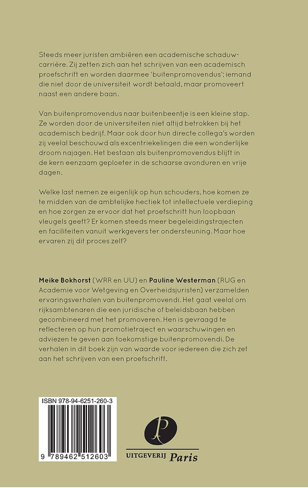 Meike Bokhorst (WRR en UU) en Pauline Westerman (RUG en Academie voor Wetgeving en Overheidsjuristen) verzamelden ervaringsverhalen van buitenpromovendi. Het gaat veelal om rijksambtenaren die een juridische of beleidsbaan hebben gecombineerd met het promoveren. Hen is gevraagd te reflecteren op hun promotietraject en waarschuwingen en adviezen te geven aan toekomstige buitenpromovendi. De verhalen in dit boek zijn van waarde voor iedereen die zich zet aan het schrijven van een proefschrift.
