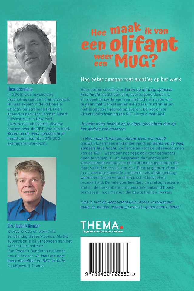 In 'Hoe maak ik van een olifant weer een mug?' bouwen IJzermans en Bender voort op Beren op de weg, spinsels in je hoofd. Ze herhalen kort de uitgangspunten van de RET - waardoor het boek ook voor beginners goed te volgen is - en bespreken de functies van verschillende emoties en de irrationele gedachten die daar vaak de oorzaak van zijn. Daarna gaan ze dieper in op veelvoorkomende problemen als uitstelgedrag, weerstand tegen verandering, schuldgevoel en onzekerheid.