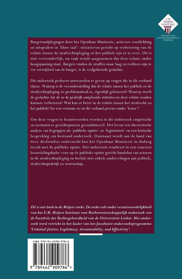 Om deze vragen te beantwoorden worden in dit onderzoek empirische en normatieve gezichtspunten gecombineerd. Het bevat een theoretische analyse van begrippen als ‘publieke opinie’ en ‘legitimiteit’ en een kritische bespreking van bestaand onderzoek. Daarnaast wordt aan de hand van twee deelstudies onderzocht hoe het Openbaar Ministerie in dialoog treedt met de publieke opinie. Het onderzoek resulteert in een concreet beoordelingskader voor op de publieke opinie gericht handelen van actoren in de strafrechtspleging en besluit met enkele aanbevelingen aan politiek, strafrechtspraktijk en wetenschap.