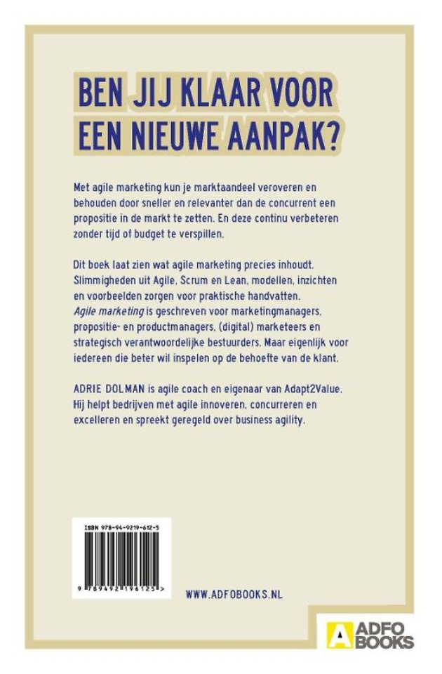 Dit boek laat zien wat agile marketing precies inhoudt. Slimmigheden uit Agile, Scrum en Lean, modellen, inzichten en voorbeelden zorgen voor praktische handvatten. Agile marketing is geschreven voor marketingmanagers, propositie- en productmanagers, (digital) marketeers en strategisch verantwoordelijke bestuurders. Maar eigenlijk voor iedereen die beter wil inspelen op de behoefte van de klant.