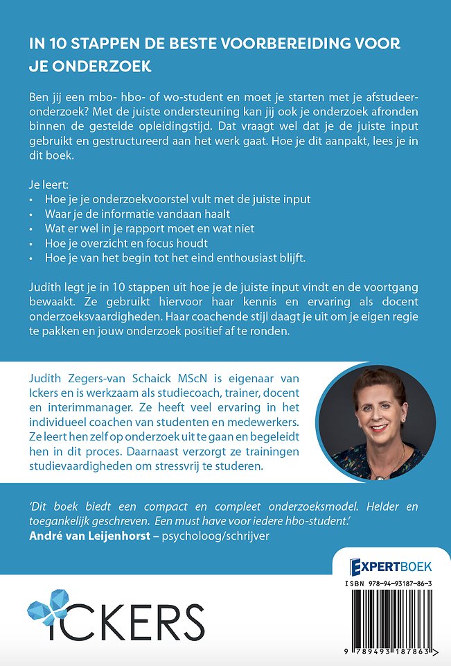 Judith legt je in 10 stappen uit hoe je de juiste input vindt en de voortgang bewaakt. Ze gebruikt hiervoor haar kennis en ervaring als docent onderzoeksvaardigheden. Haar coachende stijl daagt je uit om je eigen regie te pakken en jouw onderzoek positief af te ronden.