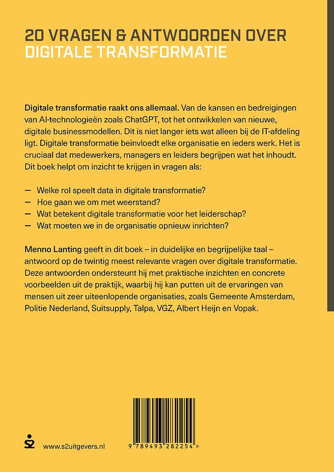 Menno Lanting geeft in dit boek - in duidelijke en begrijpelijke taal - antwoord op de twintig meest relevante vragen over digitale transformatie. Deze antwoorden ondersteunt hij met praktische inzichten en concrete voorbeelden uit de praktijk, waarbij hij kan putten uit de ervaringen van mensen uit zeer uiteenlopende organisaties, zoals Gemeente Amsterdam, Politie Nederland, Suitsupply, Talpa, VGZ, Albert Heijn en Vopak.