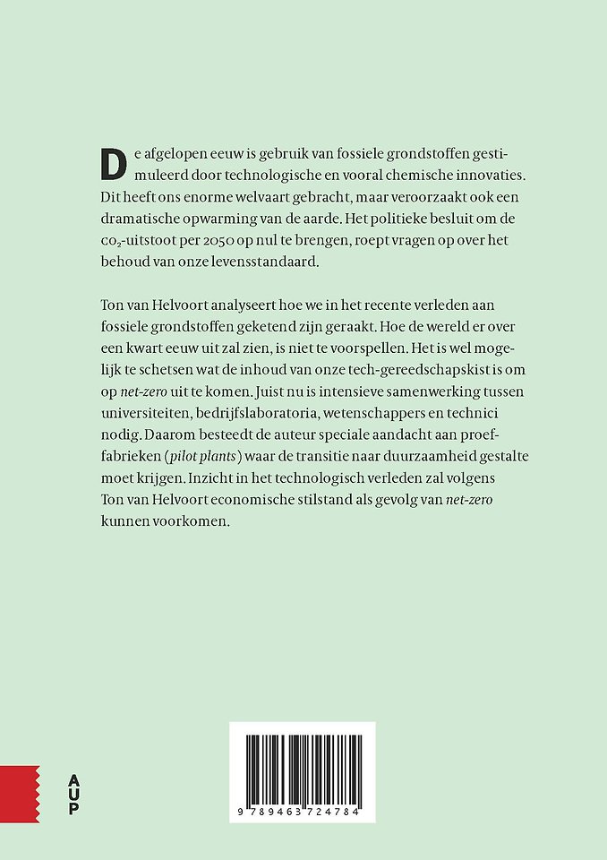 Ton van Helvoort analyseert hoe we in het recente verleden aan fossiele grondstoffen geketend zijn geraakt. Hoe de wereld er over een kwart eeuw uit zal zien, is niet te voorspellen. Het is wel mogelijk te schetsen wat de inhoud van onze tech-gereedschapskist is om op net-zero uit te komen. Juist nu is intensieve samenwerking tussen universiteiten, bedrijfslaboratoria, wetenschappers en technici nodig. Daarom besteedt de auteur speciale aandacht aan proeffabrieken (pilot plants) waar de transitie naar duurzaamheid gestalte moet krijgen.